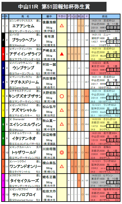 〔 中山11R 第51回報知杯弥生賞 〕 本命(◎):10 トゥザワールド 相手:3,11,6,